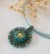 The pendant consists of a square Swarovski cabochon, small pearly lime green beads, spinning tops in the new Swarovski color "Light turquoise", metallic blue-green beads, Super Duos matching beads, Tila blue washed, mini pearls: a total of more than 100 beautiful beads! Rocaille cameo of bronze.